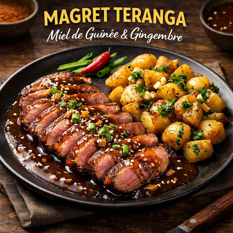 Magret de canard 450g, peau croustillante, sauce miel de Guinée & gingembre, pommes de terre sautées ail & persil.