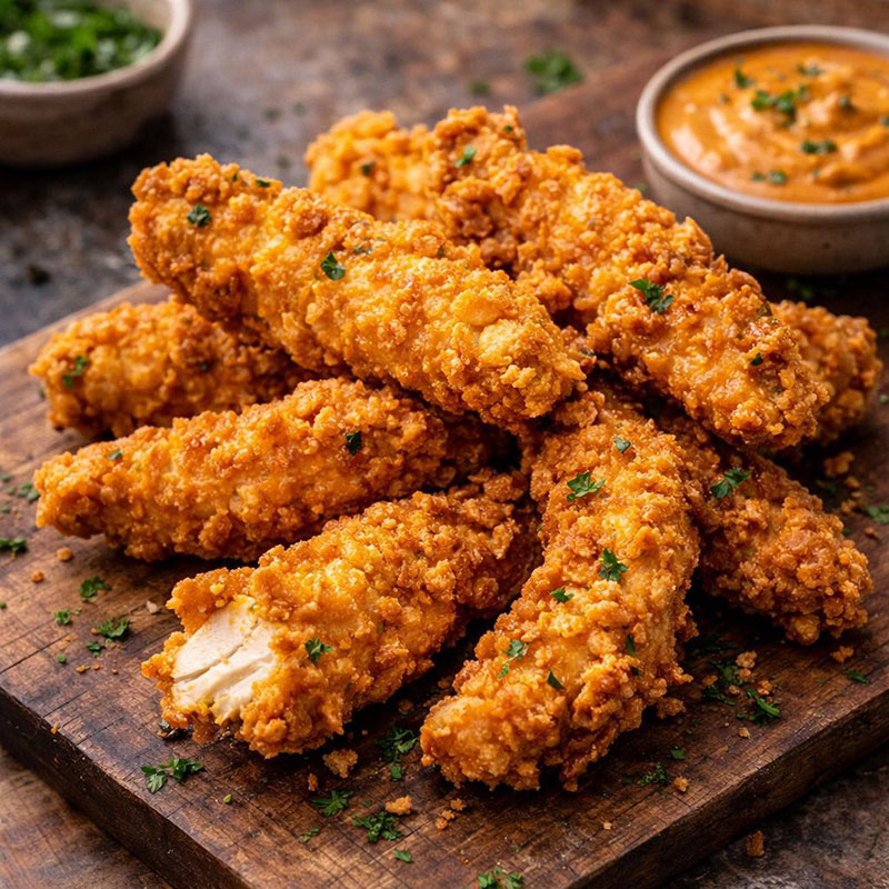 Filets de poulet croustillants, panés et dorés, servis avec une sauce gourmande.